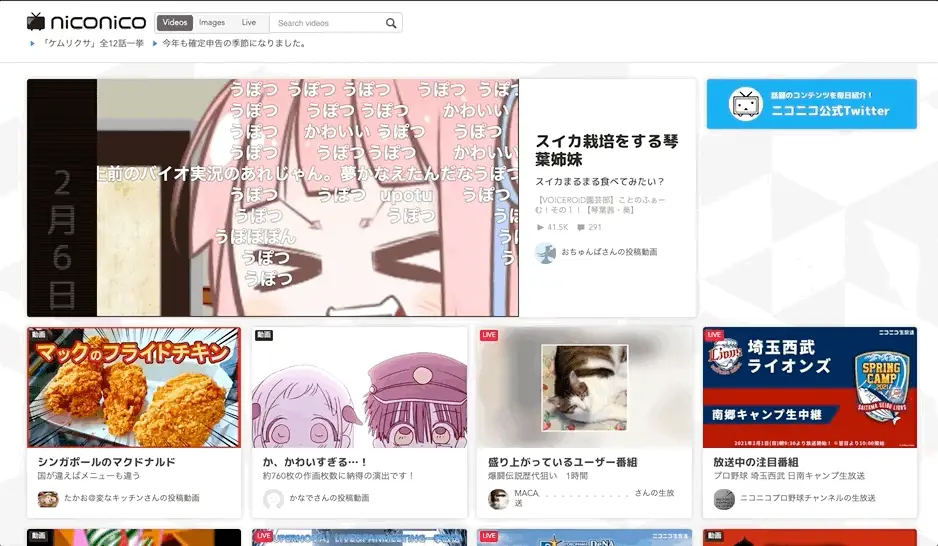 This is a screenshot of Niconico, which is a kind of competitor to Youtube and BitChute. The layout has a lot of space to the left and right, with some information smooshed in the middle. This is similar to a Japanese social media site called Mixi.