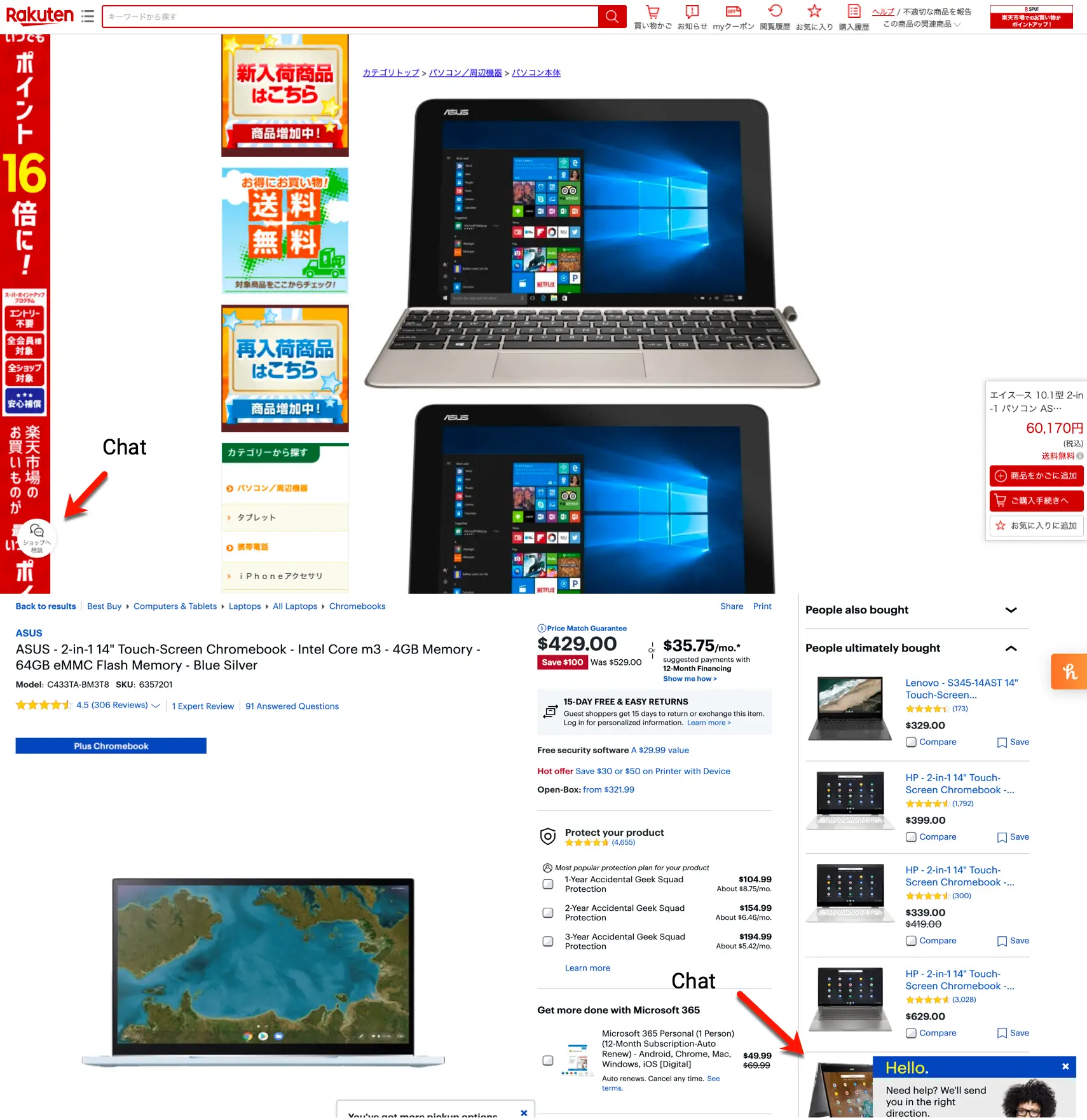 Customer help Chat is visibly easier to find on the US website while in the Japanese site seems difficult to reach.